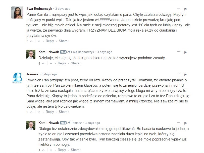 Poruszony temat odbił się szerokim echem w blogosferze. Jak mówi w rozmowie z naszą redakcją „Blog Ojciec”, był to najczęściej czytany jego wpis we wrześniu, który mocno zaangażował również społeczność blogera. On sam otrzymał wiele słów wsparcia nie tylko w komentarzach pod tekstem, ale także w prywatnych wiadomościach. - Dostałem ponad setkę komentarzy i kilkanaście prywatnych wiadomości od osób które dziękowały mi za ten wpis i spora część z nich, miała podobne doświadczenia. Kilka osób wprost też napisało, że wie, iż będzie ciężko, ale po tym wpisie ostatecznie porzuca klapsy. Jednocześnie myślę, że grupa osób, które dzięki temu wpisowi zobaczyły, że klapsy to nie jest najlepsze rozwiązanie może być znacznie większa i przyznam, że po cichu na to liczę - mówi Kamil Nowak.