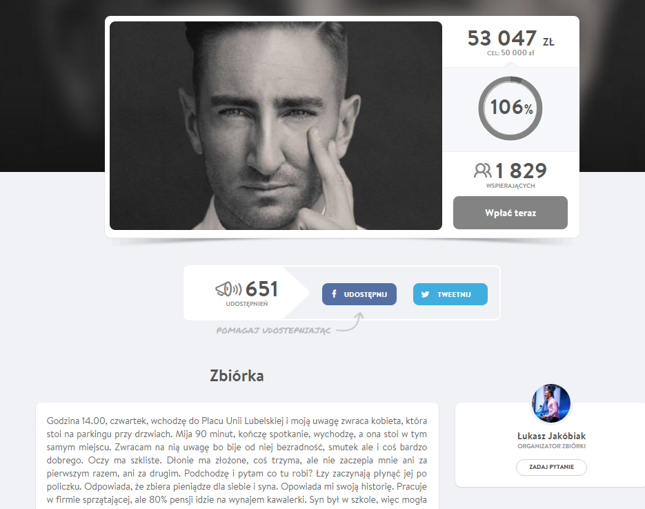 Utworzył zbiórkę dla Pani Marysi w serwisie Pomagam.pl i w przeciągu doby uzbierał 40 tysięcy z założonych 30! Pod koniec listopada cel zbiórki został zwiększony do 50 tysięcy, tak by z dostępnych środków Pani Marysia spłaciła długi oraz mogła poprawić jakość swojego życia.