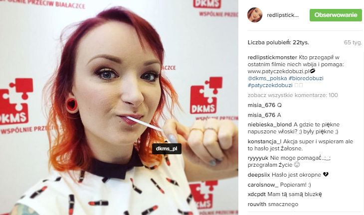 DKMS to fundacja zajmująca się szukaniem dawców szpiku i komórek macierzystych. W tamtym roku DKMS zaangażował influencerów do akcji o nieco kontrowersyjnym i przyciągającym uwagę haśle #biorędobuzi. W promocję działań DKMS zaangażowali się tacy blogerzy i youtuberzy jak: Jason Hunt, Red Lipstick Monster, czy Pani Ekscelencja.